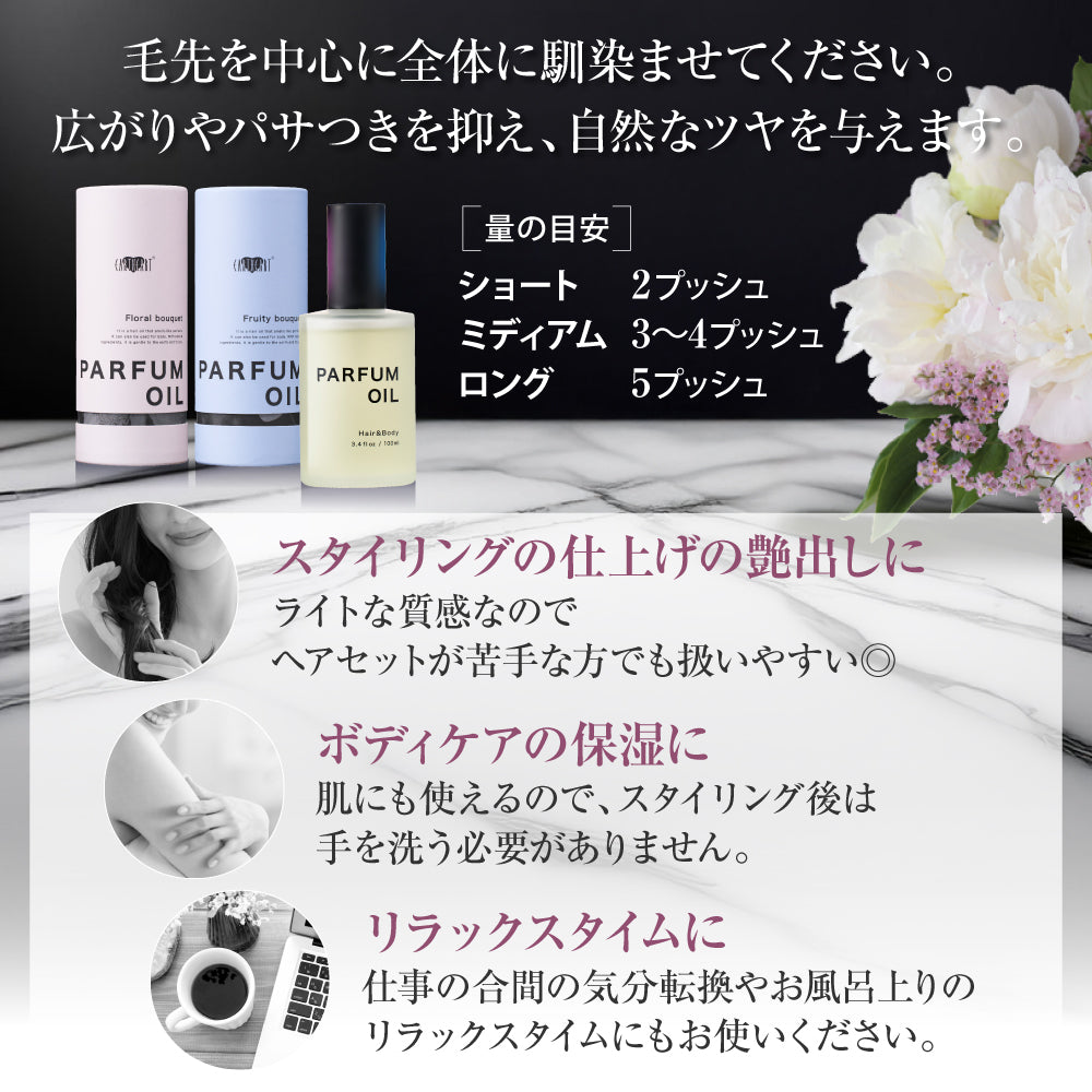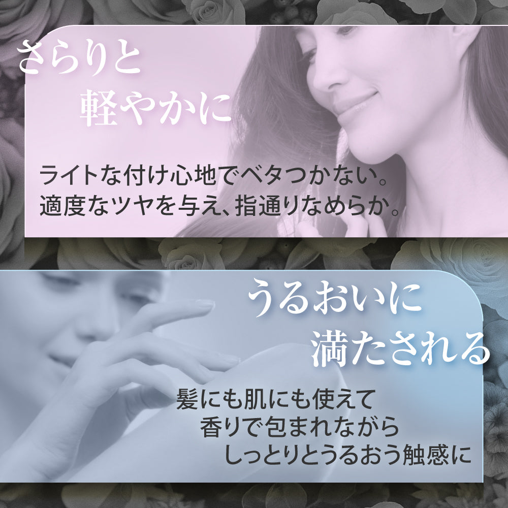 【商品説明】香水のように強く主張せず、髪にまとった瞬間からフワッと心地よい芳香に包まれます。香り立ちは穏やかに変化し、朝つけて夕方頃にはさりげない余韻を感じるラストノートへ。髪にツヤと潤いを与えるシアバターやスクワランなど数種類の天然オイルを配合し、べたつかず軽やかな仕上りに。またボディケアとして、手や肌の乾燥が気になる部分の保湿にも使えます。